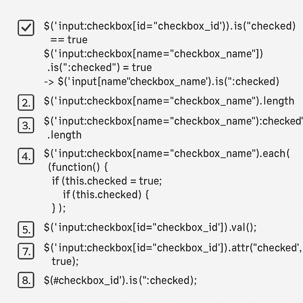 8. checkbox checked 여부 간단 확인: $("#checkbox_id"]').is(":checked"); //단일건